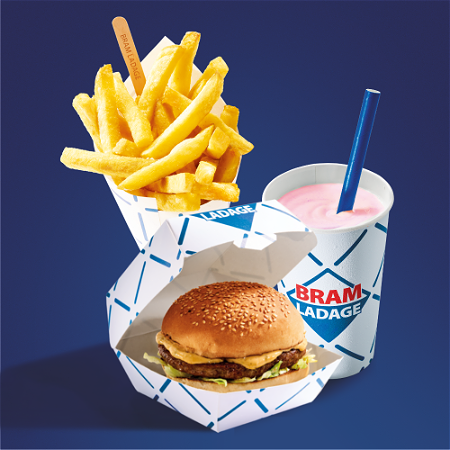 Heerlijke hamburger van 100% rundvlees op een broodje met sla en burgersaus, daarbij een lekkere verse Bram en een drankje naar keuze.